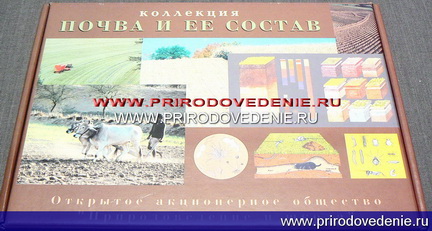 В коллекции представлены образцы почв: чернозёмной, подзолистой, торфо - перегнойной и её составляющие - глина и песок. В состав почв, кроме того, входят минеральные вещества: известняк, лесная подстилка, перегной и др. Коробка с образцами упакована в термоусадочную плёнку. На коробке печатным способом нанесено: - наименование коллекции; - наименование предприятия- изготовителя и его адрес. Размер упаковки не более 320х230х45мм. Вес не более 1,0кг.