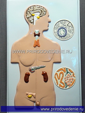 Модель изготовлена из пластмассы путем вакуумного формования. На ней показано расположение желез внутренней секреции в организме человека, а также микроскопическое строение семенников и яичников. На модели можно рассмотреть следующие железы внутренней секреции: