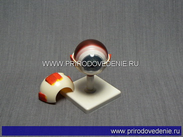 Модель изготовлена из пластмассы и установлена на пластмассовой подставке. Высота модели ≈ 15см. Модель является разборной, изображает глаз человека, демонстрирует строение зрительного анализатора. На модели цветом выделены следующие детали строения: 1. Фиброзная оболочка (склера) 9. Задняя камера глазного яблока 2. Собственно сосудистая оболочка 10. Ресничный поясок 3. Сетчатка 11. Ресничное тело 4. Радужная оболочка 12. Сосудистое тело 5.Зрачок 13. Желтое пятно 6. Роговица 14. Диск зрительного нерва 7. Хрусталик 15. Зрительный нерв 8. Передняя камера глазного яблока