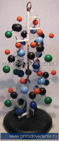 Модель представляет собой имитацию участка белковой молекулы, на котором можно рассмотреть структуру белка и взаимное расположение атомов в белковой молекуле. Модель позволяет рассмотреть первичную и вторичную структуры белка, химические связи между атомами в молекуле и между пептидами, из которых и собирается белок. Атомы разных химических элементов, из которых строится белковая молекула, обозначены на модели разным цветом и отличаются по размеру. Так, атом углерода обозначен шариком черного цвета, к нему присоединяется атом водорода оранжевого цвета, атом азота обозначается на модели шариком голубого цвета, а атом кислорода – синего. Участок пептида (аминокислоты) не принимающий участия в образовании химических связей в молекуле белка – радикал – обозначается на модели шариком зеленого цвета. Модель подвижно закреплена на металлическом штыре с подставкой. При объяснении материала учитель может перемещать цепочку полипептида вокруг оси, что позволит учащимся более детально разобраться в изучаемом вопросе.
