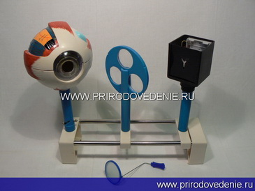 Модель очков представляет собой пластмассовый диск с тремя круглыми лунками, закрепленный на подвижной стойке непосредственно перед роговой оболочкой модели глаза. В лунки вставлены собирающая и рассеивающая линзы и обычное стекло (для сравнения результатов исследований). Модель очков прикреплена к стойке так, что может вращаться вокруг горизонтальной оси. Осветитель представляет собой электропатрон специальной формы, в который ввинчена матовая лампа накаливания. Патрон жестко закреплен внутри непрозрачного кожуха, предотвращающего попадание яркого света от лампы в глаза. Стенка кожуха, обращенная к модели глаза, имеет отверстие в виде стрелки и может отделяться от осветителя. В нижней части патрона находится кнопка включения лампы. Кожух с лампой надевается на подвижную стойку модели. Полупрозрачный экран представляет собой тонкий диск, изготовленный из прозрачного пластика, одна из поверхностей которого сделана матовой. Диск вставлен в оправу. Оправа имеет фигурную ручку. Экран используют для наблюдения изображения, даваемого хрусталиком при демонстрации дефектов зрения.
