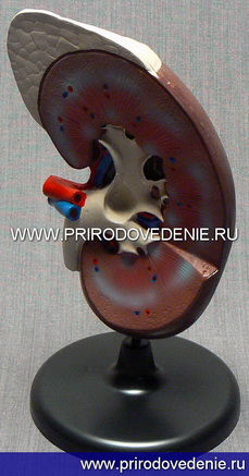 Модель неразборная, изготовлена из пластмассы, раскрашена в контрастные цвета и устанавливается на пластмассовую подставку. Высота модели в сборе ≈ 31см. Модель отображает особенности внешнего и внутреннего строение почки человека, что позволяет рассмотреть следующие детали: 1. Капсула почки 5.Почечная артерия 2. Мозговое вещество 6. Почечная вена 3.Почечная лоханка 7 Корковый слой 4. Мочеточник 8. Надпочечник
