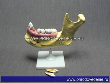 Разборная, объемная модель представляет собой увеличенный образец нижней челюсти с зубами. Она изготовлена из пластмассы, раскрашена в естественные цвета и установлена на подставку. Высота модели в сборе ≈ 30см. Модель позволяет ознакомиться со строением нижней челюсти человека, расположением на ней зубов, с подходящими к ним кровеносными сосудами и нервами, рассмотреть типы и конфигурацию зубов человека, а так же их внутреннее строение.