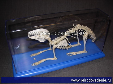 Остеологическая модель представляет собой скелет кролика, смонтированный с сохранением естественного положения тела животного и защищенный от механических повреждений прозрачным пластмассовым колпаком. Модель позволяет рассмотреть следующие особенности строения скелета млекопитающих: