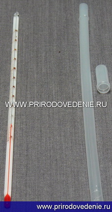 Термометр представляет собой стеклянную оцифрованную трубку с впаянным капилляром и баллоном со спиртовым раствором. Точность измерения температуры 1ºС, пределы измерения от -10ºС до +100ºС, цена деления шкалы 1ºС. Применяется при проведении лабораторных работ по калориметрии, удельной теплоемкости воды, температуры кипения различных жидкостей и др. По окончании работы с термометром, его необходимо вложить обратно в футляр (поставляется в комплекте).