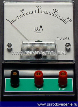 Микроамперметр представляет собой малогабаритный прибор магнитоэлектрической системы с равномерной шкалой от 0 до 200μА, с ценой деления 5μА. Он помещен в специальный корпус с приборным гнездом. Прибор имеет три входных комбинированных гнезда. Левое обозначено знаком «-» (клемма из пластмассы черного цвета), к нему подключается «минус» от источника тока. При включении необходимо соблюдать полярность (левое гнездо – отрицательное).