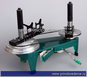 Машина состоит из следующих частей: основания на ножках с выдвижным ящичком для металлических шаров (металлические шары поставляются в комплекте в количестве 3 шт.), съемной ручки вращающей два диска переменной скорости вращения, соединенных между собой резиновым приводным ремнем. На дисках закреплено по градуированному плечу с рельсами для укладки металлических шаров и рычагов, передающих центробежную силу на цилиндрические подпружиненные кожухи вертикальных шкал. В комплект входят три металлических шара, два из которых одинакового веса, а третий более легкий.