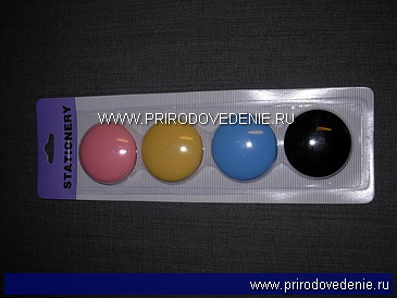 Набор представляет собой 4 магнита, лежащие внутри пластмассовых корпусов разного цвета. Их диаметр составляет 35мм.