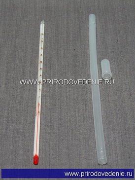 Термометр представляет собой стеклянную оцифрованную трубку с впаянным капилляром и баллоном со спиртовым раствором. Точность измерения температуры 1ºС, пределы измерения от -10ºС до +100ºС, цена деления шкалы 1ºС. Применяется при проведении лабораторных работ по калориметрии, удельной теплоемкости воды, температуры кипения различных жидкостей и др. По окончании работы с термометром, его необходимо вложить обратно в футляр (поставляется в комплекте).