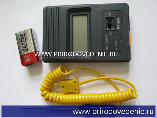 Термометр состоит из корпуса с 4-х разрядным цифровым индикатором, соединительного кабеля с металлическим измерительным щупом длиной ≈ 85 мм, питание прибора батарейка - крона. Диапазон измерения температуры в пределах от -50°С ≈ 1300°С. Размер термометра ≈110х75х25мм.
